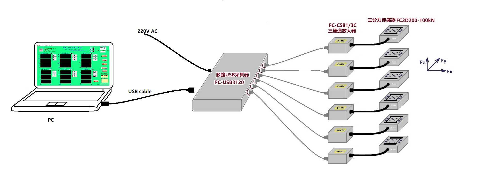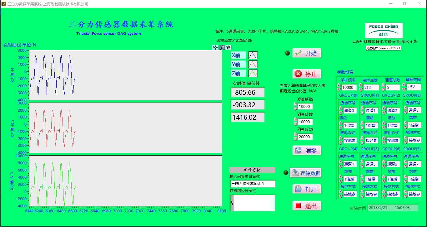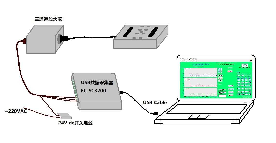 三軸力傳感器結(jié)合耐創(chuàng)三通道放大器,后端采用FC-SC3200數(shù)據(jù)采集器,數(shù)據(jù)經(jīng)過(guò)AD轉(zhuǎn)換,傳輸?shù)诫娔X端軟件,實(shí)現(xiàn)實(shí)時(shí)采集,顯示;