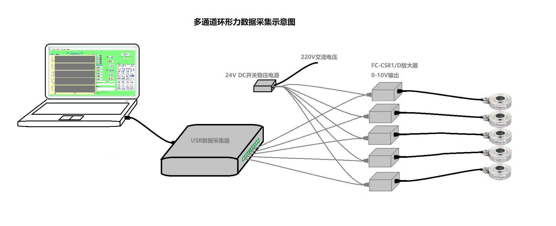 傳感器(原始mV信號(hào))-放大器(標(biāo)準(zhǔn)模擬量)-數(shù)據(jù)采集卡(通過(guò)USB)-電腦界面軟件(基于NI LabView編程)