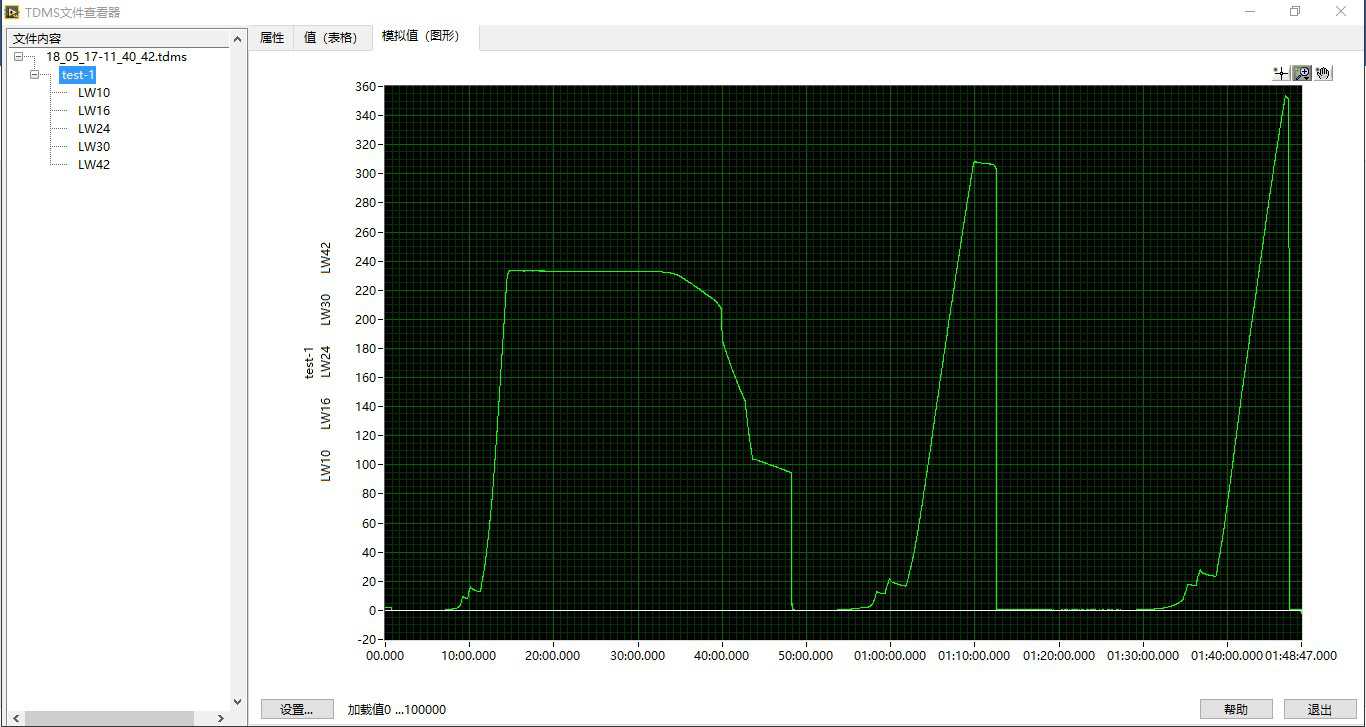 數(shù)據(jù)存儲(chǔ)為TDMS格式文件,支持導(dǎo)出為Excel和圖表,并且在軟件運(yùn)行界面支持?jǐn)?shù)據(jù)查看;可以調(diào)出曲線(xiàn)以及數(shù)據(jù)表格;
